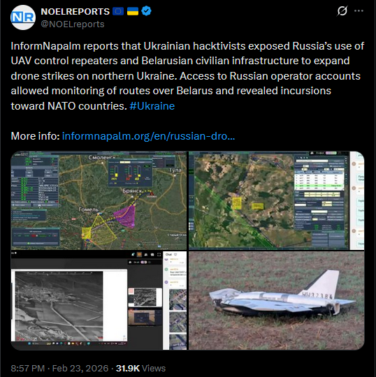 InformNapalm reports that Ukrainian hacktivists exposed Russia’s use of UAV control repeaters and Belarusian civilian infrastructure to expand drone strikes on northern Ukraine. Access to Russian operator accounts allowed monitoring of routes over Belarus and revealed incursions toward NATO countries. #UkraineMore info: https://informnapalm.org/en/russian-drone-operators-use-belarus/https://x.com/NOELreports/status/2026038821712810419?s=20>23hpic 1https://files.catbox.moe/1nnq12.jpgpic 2https://files.catbox.moe/1nl9sb.jpgpic 3https://files.catbox.moe/azh76q.jpgpic 4https://files.catbox.moe/m3kig5.jpg
