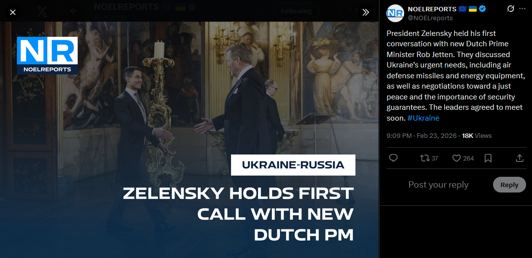President Zelensky held his first conversation with new Dutch Prime Minister Rob Jetten. They discussed Ukraine’s urgent needs, including air defense missiles and energy equipment, as well as negotiations toward a just peace and the importance of security guarantees. The leaders agreed to meet soon. #Ukrainehttps://x.com/NOELreports/status/2026041802055184738?s=20>23h