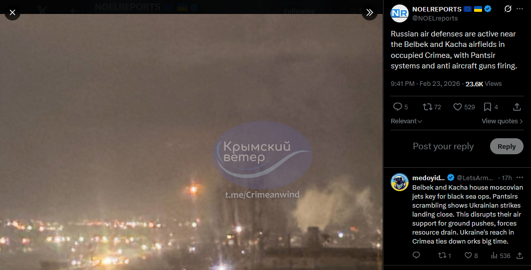 Russian air defenses are active near the Belbek and Kacha airfields in occupied Crimea, with Pantsir systems and anti aircraft guns firing.https://x.com/NOELreports/status/2026049852375740648?s=20>23h