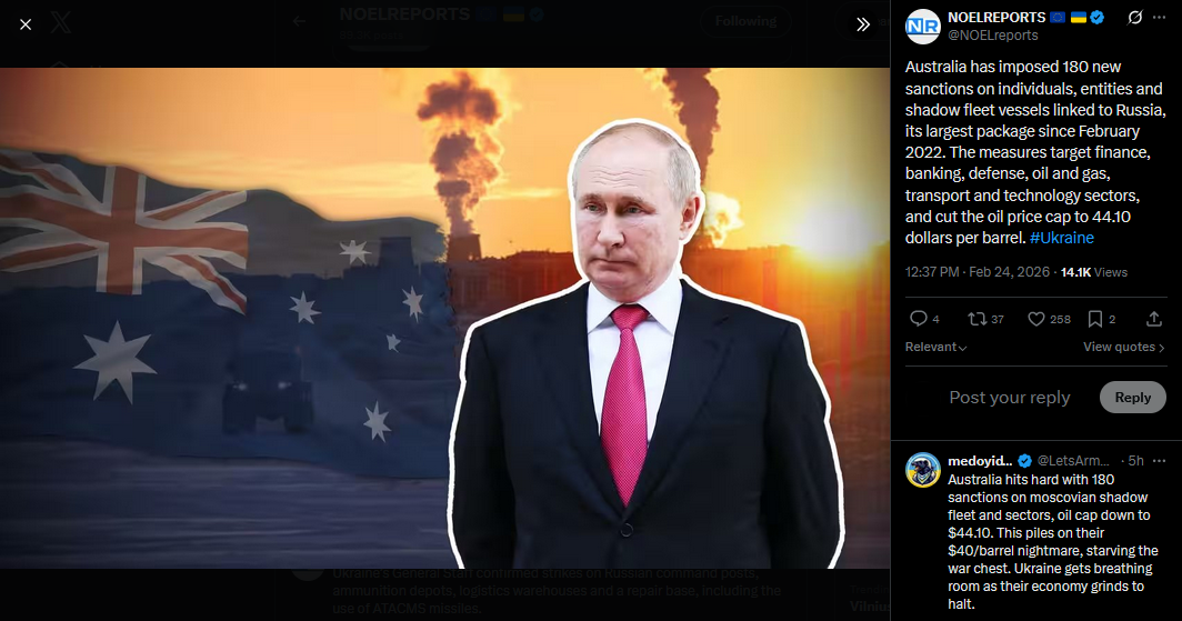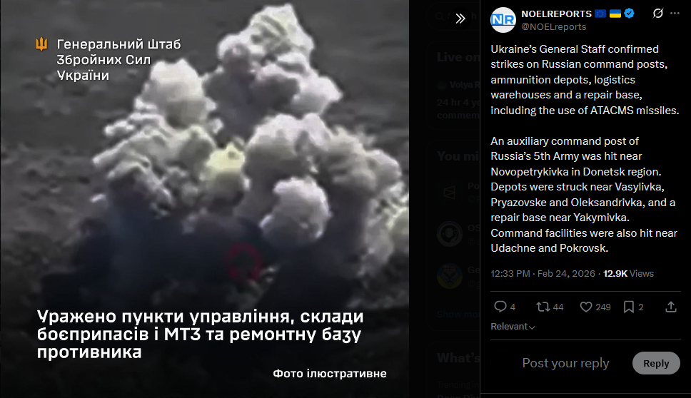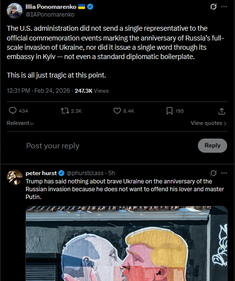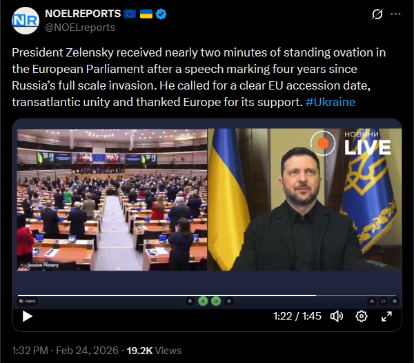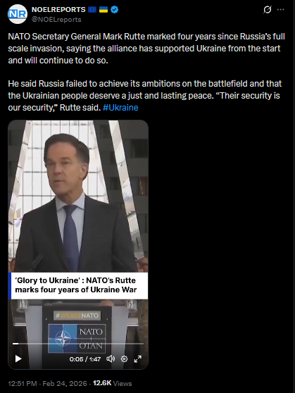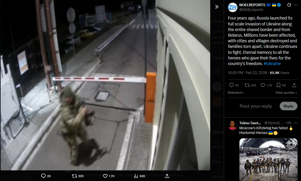 Four years ago, Russia launched its full scale invasion of Ukraine along the entire shared border and from Belarus. Millions have been affected, with cities and villages destroyed and families torn apart. Ukraine continues to fight. Eternal memory to all the heroes who gave their lives for the country’s freedom. #Ukrainehttps://x.com/NOELreports/status/2026055810200060262?s=20>22h