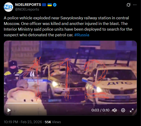 A police vehicle exploded near Savyolovsky railway station in central Moscow. One officer was killed and another injured in the blast. The Interior Ministry said police units have been deployed to search for the suspect who detonated the patrol car. #Russiahttps://x.com/NOELreports/status/2026059395587621350?s=20>22hhttps://files.catbox.moe/82s2wq.mp4
