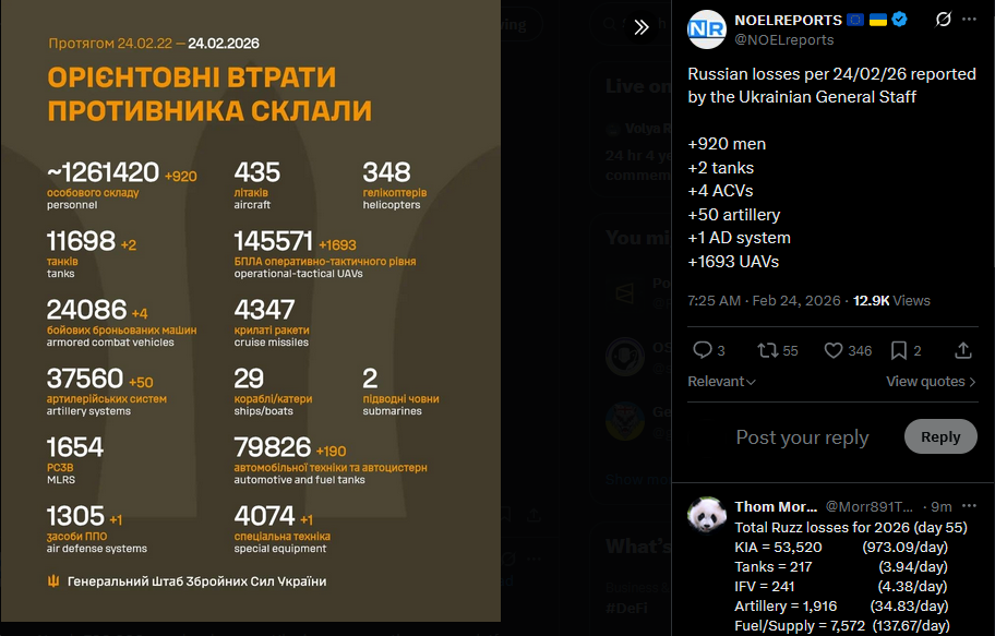 Previous: >>529138708Day 1,462 – Daily assessment: understandingwar.org/analysis/russia-ukraine/#research▶Latest>4th anniversary of the 3-day SMO - Costa & Von Der Leyen in Kyiv, promising €90bil aid regardless of vetoes>CSIS: RU casualties at ~1.2 mil with 325,000 dead or missing, UKR at roughly half that number>Ukrainians have now retaken 400sqkm of their land undoing zuzzian gains since October, with local offensives in Dnipropetrovsk and Zaporizhia>UAF used ATACMS to strike a support command post of the 5th Russian Army in the Donetsk region.>Ukrainian drones destroyed Ka-52, Mi-8 helicopters at Oryol aerodrome>Ukrainian drones attacked the Kaleikino oil pumping station>Drones attacked the Neftegorsk gas processing plant in the Samara region>FP-5 Flamingo missiles hit russian Iskander engine factory in Udmurtia>Hungary and SlovACKia threaten Ukraine over stalled "Druzhba" oil shipments>USF destroyed a modernized russian Tornado-S in Zapo>Drones strike electronics plant in Mordovia>Ukrainian Forces Hit Two russian Patrol Ships, Two Be-12 Aircraft in Crimea>SBU drones attacked the Metafrax Chemicals plant in the Perm region>Geneva talks over, SSDD>One-Third of Russia’s Military Personnel Costs Are Death Benefits>Ilsky refinery droned>Ukrainian and russian sources confirm that Ukraine now has a foothold in the centre of Chasiv Yar.>NATO’s Rutte: russia lost 65k people in December and January>China prepares new energy aid package for Ukraine▶Telegramrentry.org/telosint2023t.me/ukr_pics▶Intelt.me/DeepStateENodin.tradoc.army.mil/WEG (equipment explorer)ukr.warspotting.net (visually confirmed losses)▶Mapsdeepstatemap.live/enliveuamap.com/en▶DISPOSABLE SOLDIER (diary of a RU mobik)TOURS 1-4: files.catbox.moe/mpcw7p.zip▶12 min of TZD in one ditch (Pokrovsk area) - 28 killedfiles.catbox.moe/sxbxfb.mp4