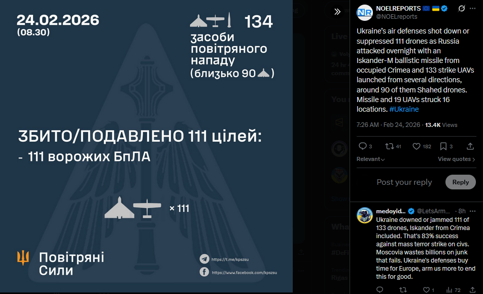 >>529147031Ukraine’s air defense has destroyed more than 140,000 Russian targets since the start of the full scale invasion. The tally includes 86 Kinzhal missiles, 709 Kalibr missiles, 2,459 Kh 101 cruise missiles, 274 Iskander ballistic missiles and 44,700 Shahed drones. #Ukrainehttps://x.com/NOELreports/status/2026419635277500870?s=20https://files.catbox.moe/d0d3jj.mp4