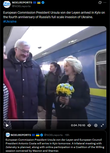 European Commission President Ursula von der Leyen arrived in Kyiv on the fourth anniversary of Russia’s full scale invasion of Ukraine. #Ukrainehttps://x.com/NOELreports/status/2026197389346758940?s=20>13hhttps://files.catbox.moe/1py9zt.mp4