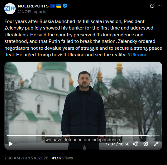 >>529147031Four years after Russia launched its full scale invasion, President Zelensky publicly showed his bunker for the first time and addressed Ukrainians. He said the country preserved its independence and statehood, and that Putin failed to break the nation. Zelensky ordered negotiators not to devalue years of struggle and to secure a strong peace deal. He urged Trump to visit Ukraine and see the reality. #Ukrainehttps://x.com/NOELreports/status/2026198078147965373?s=20>13hhttps://files.catbox.moe/fz792v.mp4>18 minute video