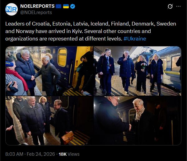 Leaders of Croatia, Estonia, Latvia, Iceland, Finland, Denmark, Sweden and Norway have arrived in Kyiv. Several other countries and organizations are represented at different levels. #Ukrainehttps://x.com/NOELreports/status/2026206356512923933?s=20>13h