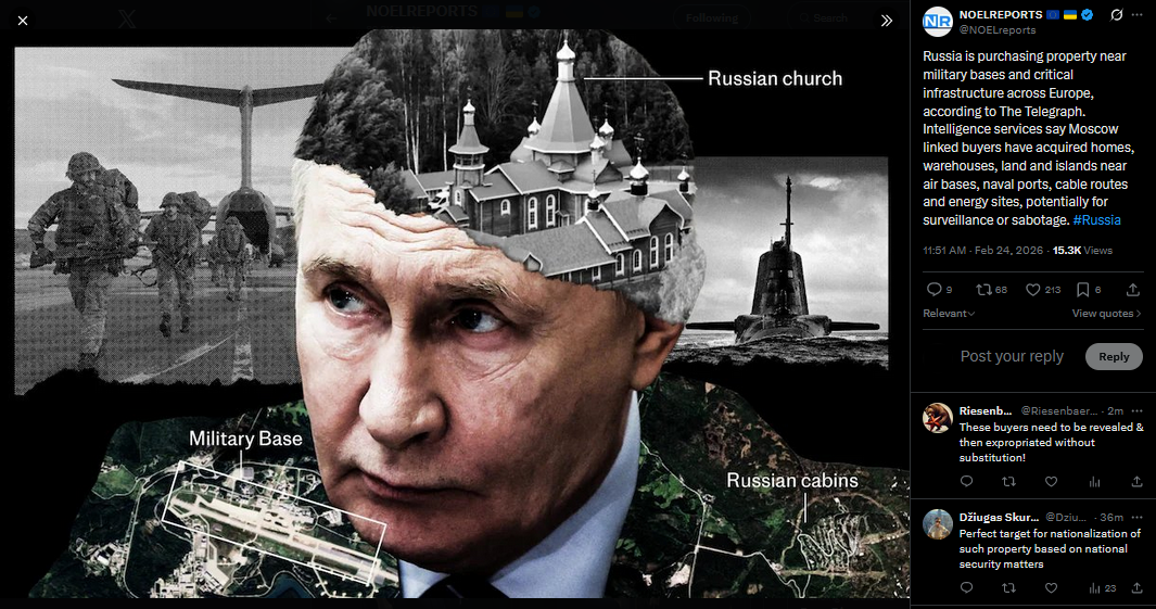 >>529149533 oh yesRussia is purchasing property near military bases and critical infrastructure across Europe, according to The Telegraph. Intelligence services say Moscow linked buyers have acquired homes, warehouses, land and islands near air bases, naval ports, cable routes and energy sites, potentially for surveillance or sabotage. #Russiahttps://x.com/NOELreports/status/2026263727503220807?s=20