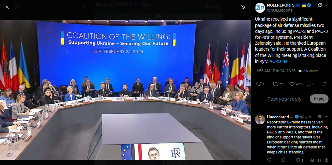 Ukraine received a significant package of air defense missiles two days ago, including PAC-2 and PAC-3 for Patriot systems, President Zelensky said. He thanked European leaders for their support. A Coalition of the Willing meeting is taking place in Kyiv. #Ukrainehttps://x.com/NOELreports/status/2026264824565371339?s=20>9h