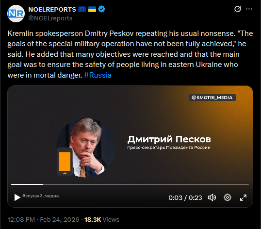 Kremlin spokesperson Dmitry Peskov repeating his usual nonsense. "The goals of the special military operation have not been fully achieved," he said. He added that many objectives were reached and that the main goal was to ensure the safety of people living in eastern Ukraine who were in mortal danger. #Russiahttps://x.com/NOELreports/status/2026267943454027818?s=20>9h
