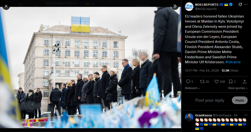 EU leaders honored fallen Ukrainian heroes at Maidan in Kyiv. Volodymyr and Olena Zelensky were joined by European Commission President Ursula von der Leyen, European Council President Antonio Costa, Finnish President Alexander Stubb, Danish Prime Minister Mette Frederiksen and Swedish Prime Minister Ulf Kristersson. #Ukrainehttps://x.com/NOELreports/status/2026270300107595802?s=20>9h