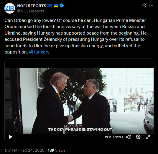 >>529147320Poland’s Foreign Minister Radoslaw Sikorski said he is shocked by Hungary’s position as Ukraine fights Russia. He noted Budapest was invaded twice in the 20th century and said he expected more solidarity with Ukraine instead of hostility fueled by government messaging. #Ukrainehttps://x.com/NOELreports/status/2026013266242130310?s=20>23thhttps://files.catbox.moe/gar084.mp4