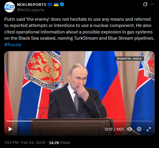 This Turkish news source quotes Putin and writes in the future tense.>Ukraine plotting attacks on TurkStream, Blue Stream pipelines: Putin https://www.dailysabah.com/business/energy/ukraine-plotting-attacks-on-turkstream-blue-stream-pipelines-putinIn the Twatter vid Putin said these explosions have already happened and that Ukraine is behind them. So past tense.https://xcancel.com/visegrad24/status/2026298592063787240Is monke losing it or is he revealing ahead of time his plan to blow up his gas pipelines to Turkey?