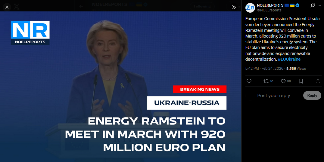 European Commission President Ursula von der Leyen and European Council President Antonio Costa will arrive in Kyiv tomorrow. A trilateral meeting with Zelensky is planned, along with online participation in a Coalition of the Willing session convened by Macron and Starmer. #Ukrainehttps://x.com/NOELreports/status/2026040666904809490?s=20>23h