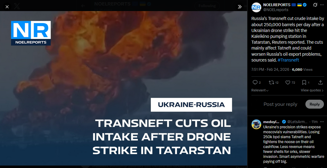 >>529150722>>529147031Russia’s Transneft cut crude intake by about 250,000 barrels per day after a Ukrainian drone strike hit the Kaleikino pumping station in Tatarstan, Reuters reported. The cuts mainly affect Tatneft and could worsen Russia’s oil export problems, sources said. #Transnefthttps://x.com/NOELreports/status/2026384465749070127?s=20>2h