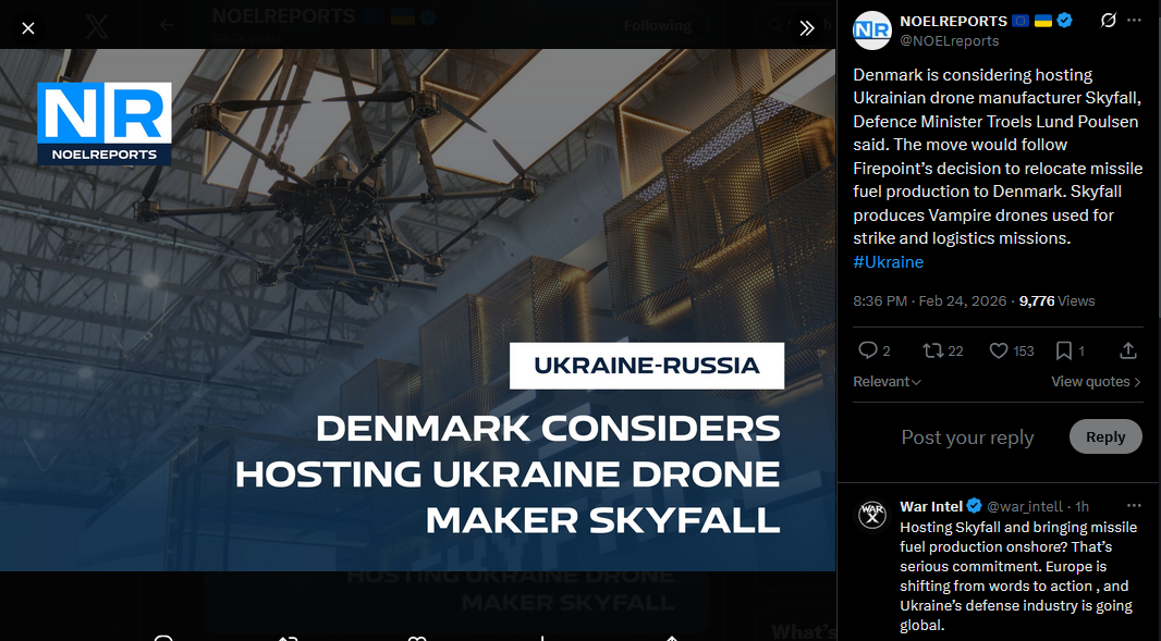 Denmark is considering hosting Ukrainian drone manufacturer Skyfall, Defence Minister Troels Lund Poulsen said. The move would follow Firepoint’s decision to relocate missile fuel production to Denmark. Skyfall produces Vampire drones used for strike and logistics missions. #Ukrainehttps://x.com/NOELreports/status/2026395777468362815?s=20>1h