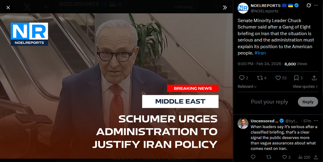Senate Minority Leader Chuck Schumer said after a Gang of Eight briefing on Iran that the situation is serious and the administration must explain its position to the American people. #Iranhttps://x.com/NOELreports/status/2026401953958257071?s=20>1h