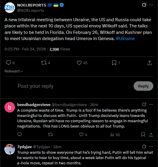 A new trilateral meeting between Ukraine, the US and Russia could take place within the next 10 days, US special envoy Witkoff said. The talks are likely to be held in Florida. On February 26, Witkoff and Kushner plan to meet Ukrainian delegation head Umerov in Geneva. #Ukrainehttps://x.com/NOELreports/status/2026408098705908106?s=20>44m