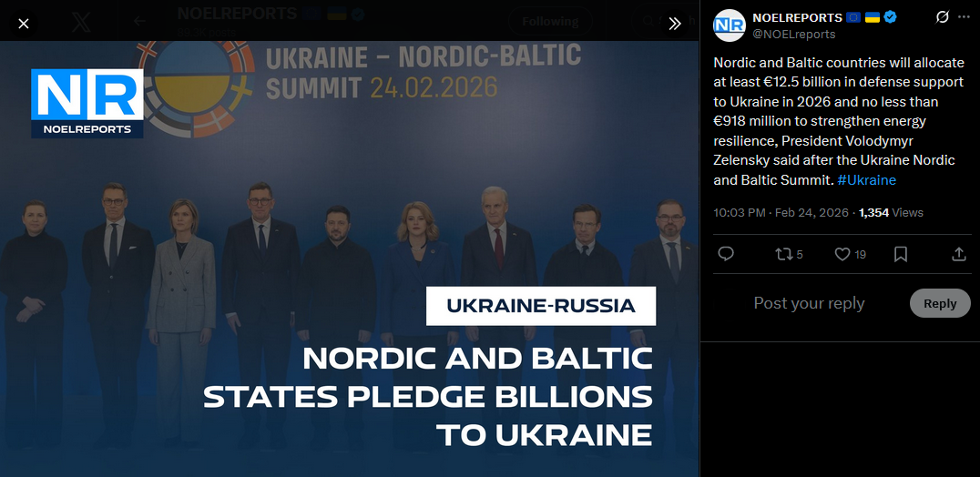 >>529147031Nordic and Baltic countries will allocate at least €12.5 billion in defense support to Ukraine in 2026 and no less than €918 million to strengthen energy resilience, President Volodymyr Zelensky said after the Ukraine Nordic and Baltic Summit. #Ukrainehttps://x.com/NOELreports/status/2026417812755845402?s=20>6m