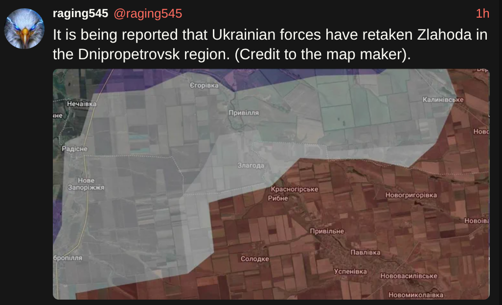 >>529148630They have cleared quite a lot north of hulyaipole. They look to be aiming for the road to allow flanking the town but I think they'd probably be better linking up with units moving south to the east of them. Could cut off quite a chunk and then pivot behind hulyaipole. The ziggers attempted to attack through hulyaipole to ease pressure from the river crossing to their north but it didn't work and they lost 40 attackers in a day for the attempt. It's all looking very positive. Small gains but massive for morale. Ziggers must be devastated after the effort spent taking these places. Ukies must be buzzing finally fighting back instead of just defending. With russian Comms down I hope they keep pushing and cleave into them hard. Could start something bigger if they have reinforcement behind them in reserve. Either way, looks like they will be keeping everything local west of the river for sure.