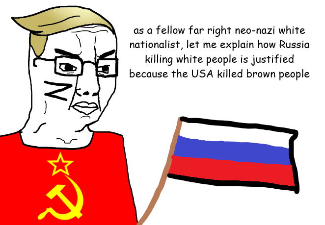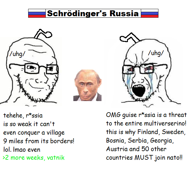 >>529188830>Schrödinger's Russia>thinks this is a contradictiona country can be too incompetent to achieve its war goals AND still be a dangerous threat to its neighbors. these aren't mutually exclusive, retard. a drunk with a gun can't hit the broad side of a barn and is still a threat to the entire neighborhood. Russia can't take Chasiv Yar after a year of trying AND is still a country with 6,000 nukes that blows up civilian infrastructure for fun, sabotages Baltic cables, and assassinates people on NATO soil with nerve agents. Finland and Sweden didn't join NATO because Russia is competent, they joined because Russia is unhinged. nobody is afraid of Russian military genius, they're afraid of Russian military stupidity. the meme format where you drew the other side as basedjak is not in fact an argument :DDDD