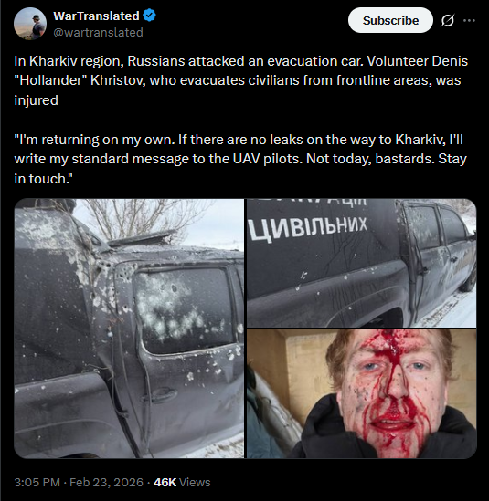 In Kharkiv region, Russians attacked an evacuation car. Volunteer Denis "Hollander" Khristov, who evacuates civilians from frontline areas, was injured"I'm returning on my own. If there are no leaks on the way to Kharkiv, I'll write my standard message to the UAV pilots. Not today, bastards. Stay in touch."https://x.com/wartranslated/status/2025950208144601335?s=20>23th