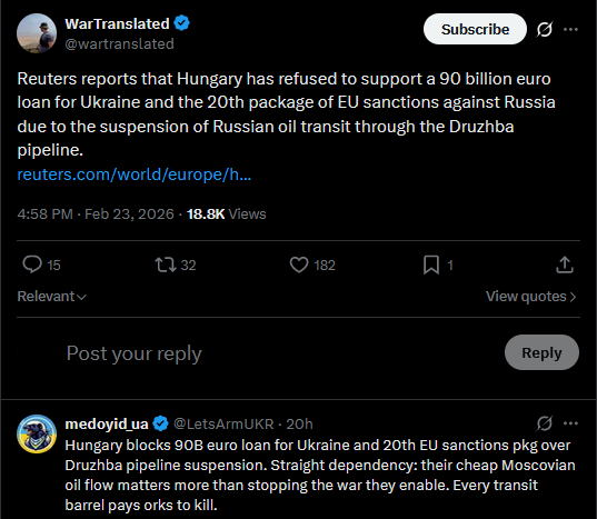 Reuters reports that Hungary has refused to support a 90 billion euro loan for Ukraine and the 20th package of EU sanctions against Russia due to the suspension of Russian oil transit through the Druzhba pipeline.https://reuters.com/world/europe/hungary-vows-block-eu-sanctions-russia-eve-ukraine-war-anniversary-2026-02-23/https://x.com/wartranslated/status/2025978617335890318?s=20>23th