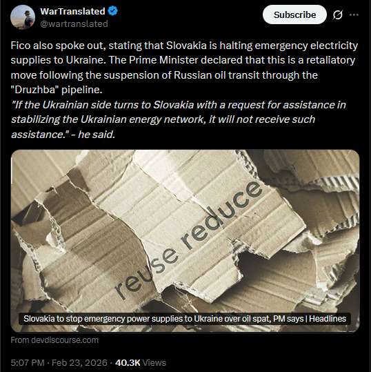 Fico also spoke out, stating that Slovakia is halting emergency electricity supplies to Ukraine. The Prime Minister declared that this is a retaliatory move following the suspension of Russian oil transit through the "Druzhba" pipeline."If the Ukrainian side turns to Slovakia with a request for assistance in stabilizing the Ukrainian energy network, it will not receive such assistance." - he said.https://x.com/wartranslated/status/2025980819060261353?s=20>23thhttps://www.devdiscourse.com/article/headlines/3815027-slovakia-to-stop-emergency-power-supplies-to-ukraine-over-oil-spat-pm-says
