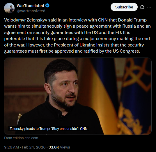 Volodymyr Zelenskyy said in an interview with CNN that Donald Trump wants him to simultaneously sign a peace agreement with Russia and an agreement on security guarantees with the US and the EU. It is preferable that this take place during a major ceremony marking the end of the war. However, the President of Ukraine insists that the security guarantees must first be approved and ratified by the US Congress.https://x.com/wartranslated/status/2026227259057537416?s=20>22hhttps://edition.cnn.com/2026/02/23/europe/zelensky-trump-ukraine-russia-war-intl-latam
