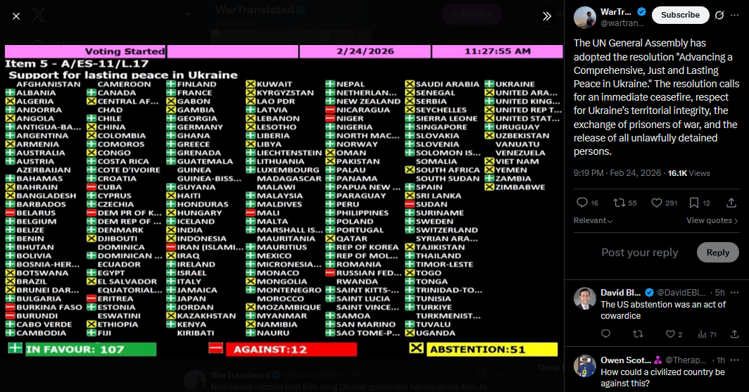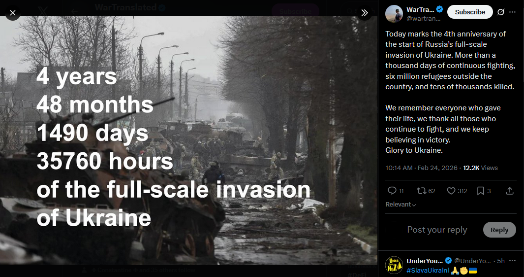 Today marks the 4th anniversary of the start of Russia’s full-scale invasion of Ukraine. More than a thousand days of continuous fighting, six million refugees outside the country, and tens of thousands killed.We remember everyone who gave their life, we thank all those who continue to fight, and we keep believing in victory. Glory to Ukraine.https://x.com/wartranslated/status/2026239376498311272?s=20>21h
