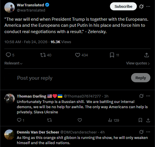 >>529184209"The war will end when President Trump is together with the Europeans. America and the Europeans can put Putin in his place and force him to conduct real negotiations with a result." - Zelensky.https://x.com/wartranslated/status/2026250317273190840?s=20>20h