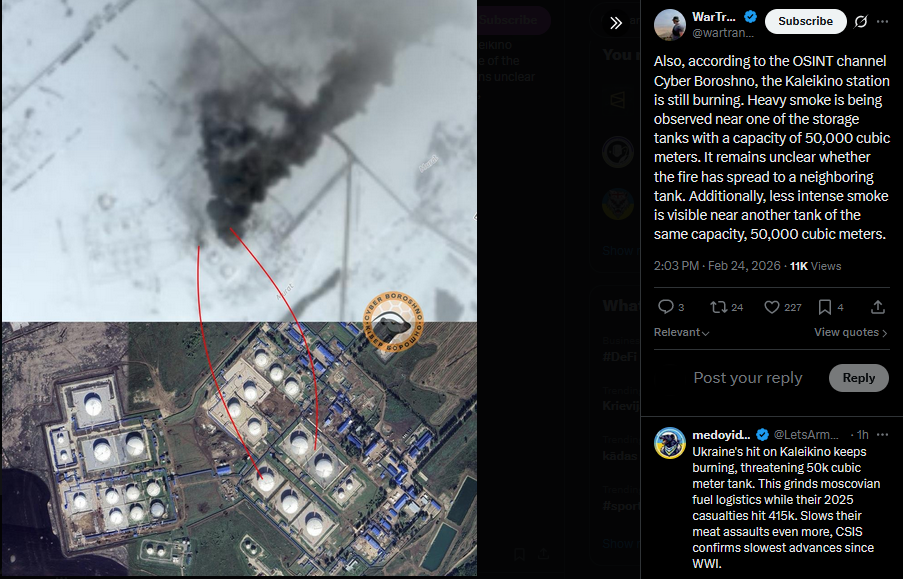 Also, according to the OSINT channel Cyber Boroshno, the Kaleikino station is still burning. Heavy smoke is being observed near one of the storage tanks with a capacity of 50,000 cubic meters. It remains unclear whether the fire has spread to a neighboring tank. Additionally, less intense smoke is visible near another tank of the same capacity, 50,000 cubic meters.https://x.com/wartranslated/status/2026297000233205963?s=20>17h