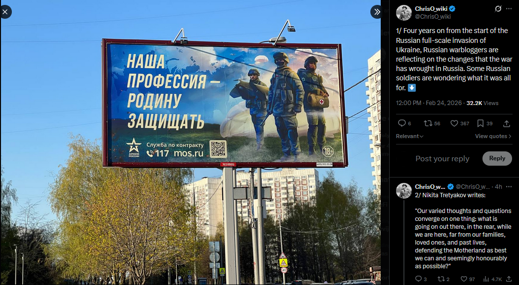 1/ Four years on from the start of the Russian full-scale invasion of Ukraine, Russian warbloggers are reflecting on the changes that the war has wrought in Russia. Some Russian soldiers are wondering what it was all for.https://x.com/ChrisO_wiki/status/2026265891550163110?s=20>19h2/ Nikita Tretyakov writes:"Our varied thoughts and questions converge on one thing: what is going on out there, in the rear, while we are here, far from our families, loved ones, and past lives, defending the Motherland as best we can and seemingly honourably as possible?"3/ "What is going on there in this very Motherland behind our backs?Why does it feel more and more uncomfortable to walk around our cities in military uniform – now including Donetsk and Luhansk – every year? Is it even inappropriate?4/ "And why, instead of "military," "soldier," or "frontline fighter" have we suddenly started calling them, often with a hint of disgust, "SVOshnik"?5/ "Why is life—utilities, groceries, gasoline, transportation, everything!—so expensive, as if we were suddenly paying tribute as a country to the Golden Horde?6/ "Why did we leave for war from a country with an advanced digital development, proud of our convenient use of government services, banks, and even deliveries—…7/ …and now, when we return on vacation to, say, Krasnoyarsk, we find that our mobile internet (which, by the way, was paid for as a service under a tariff) is disconnected, and geolocation doesn't work?8/ "Why did we previously save from a frontline soldier's salary for a down payment on an apartment, while now, at best, we save for a mediocre car, even though the salary, apartment, and car themselves are still the same?9/ "Why, in order to stay in touch with our families on the home front, do we have to constantly invent something—something will be slowed down, something else will be cut off?>part 1