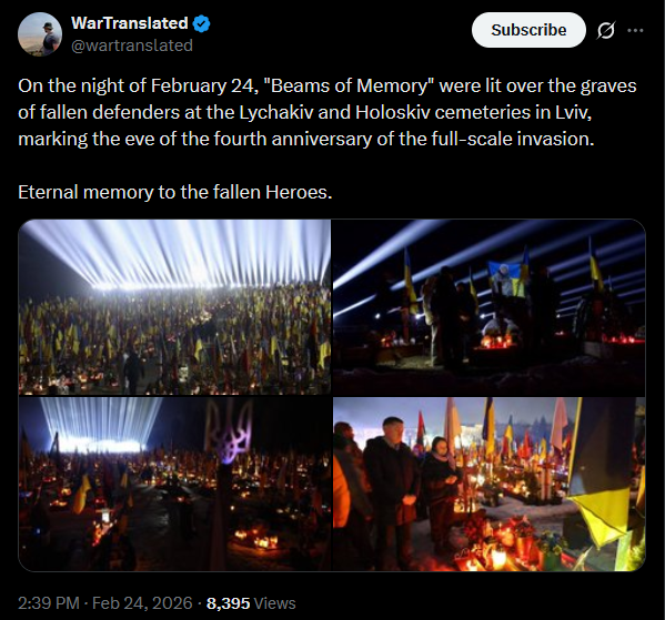 On the night of February 24, "Beams of Memory" were lit over the graves of fallen defenders at the Lychakiv and Holoskiv cemeteries in Lviv, marking the eve of the fourth anniversary of the full-scale invasion.Eternal memory to the fallen Heroes.https://x.com/wartranslated/status/2026305885601997150?s=20>17h