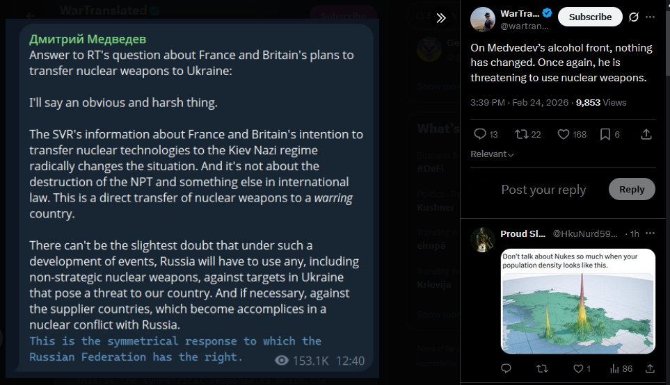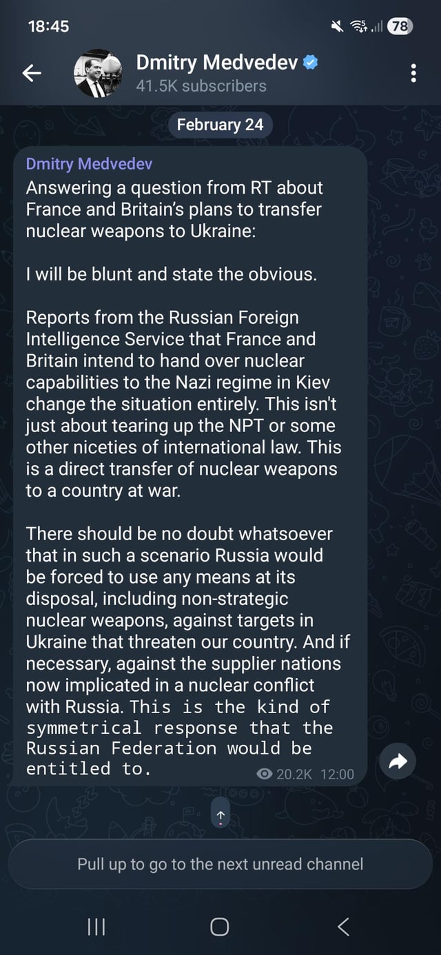On Medvedev’s alcohol front, nothing has changed. Once again, he is threatening to use nuclear weapons.https://x.com/wartranslated/status/2026321182689997005?s=20>16h