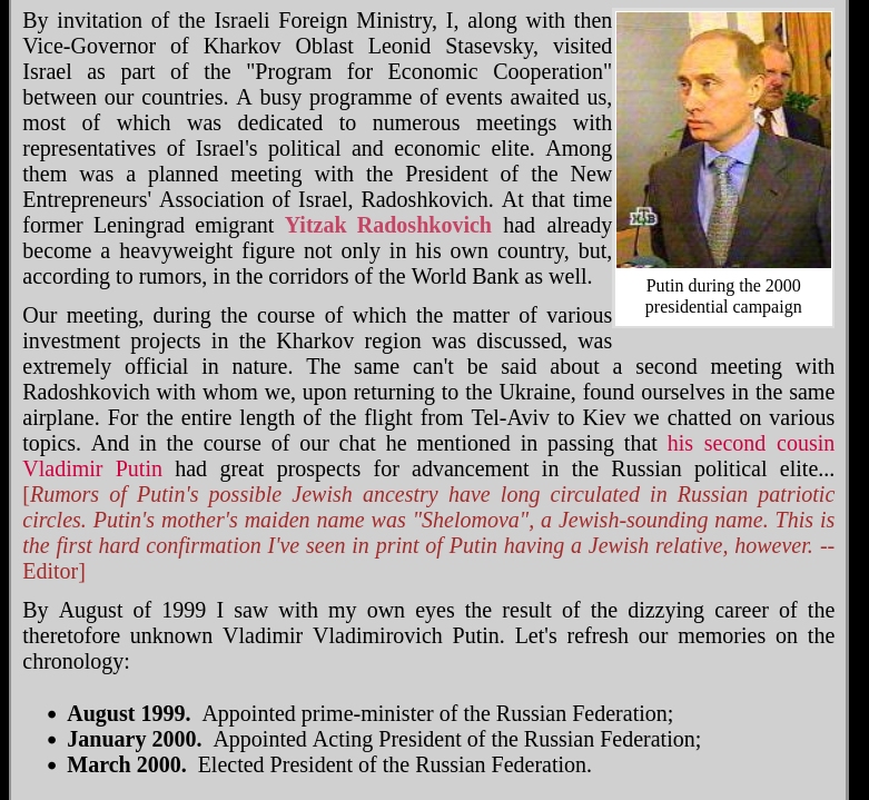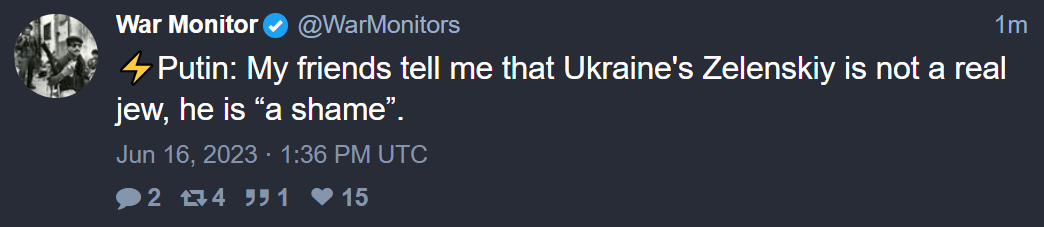 Putin is 100% a Jew. Otherwise the video of him saying Jews are his people wouldn’t be banned in Russiahttps://web.archive.org/web/20220210141846/https://minjust.gov.ru/ru/extremist-materials/?id=9860https://minjust.gov.ru/ru/extremist-materials/?id=9860Translate 4933http://pravo.minjust.ru/extremist-materials?combine=&page=471Why would russian government ban the video that doesn't exist?https://files.catbox.moe/4uf1rj.mp4