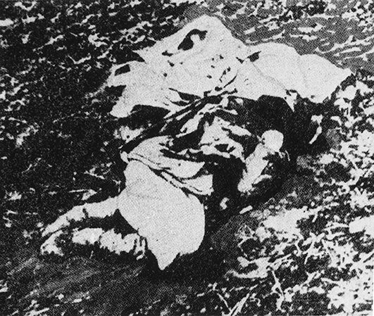 >>529195112A baby near the body of a mother who died of starvation. Reproduction from a magazine