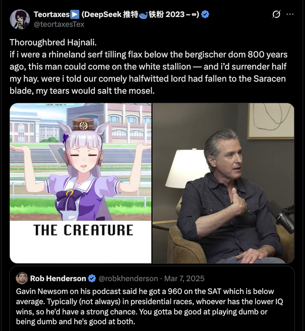 >>529243677Where does this forced meme come from? It doesn't even make sense. Is the joke just that he looks le funny haircut and fat? That said fuck vance for being zog and a jeet lover. He's probably smarter than newsome but I still think newsome would beat him due to aura, looks, a massive dem pendulum swing and every democrat voting cheat being employed. Redistricting does help vance and so would a trump vp but trump may be too old by then and the zog bootlicking may have eroded his base.