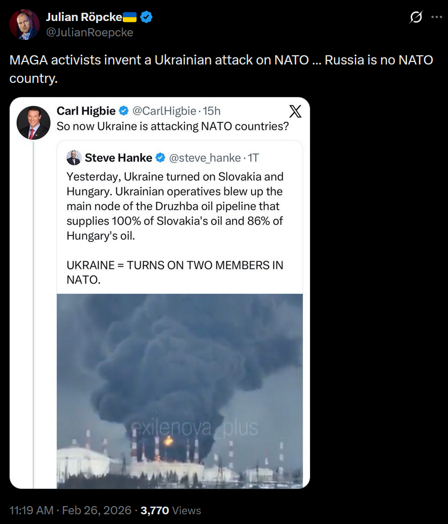 https://x.com/JulianRoepcke/status/2026950211881279779>MAGA activists invent a Ukrainian attack on NATO … Russia is no NATO country.bomb the hyhyls
