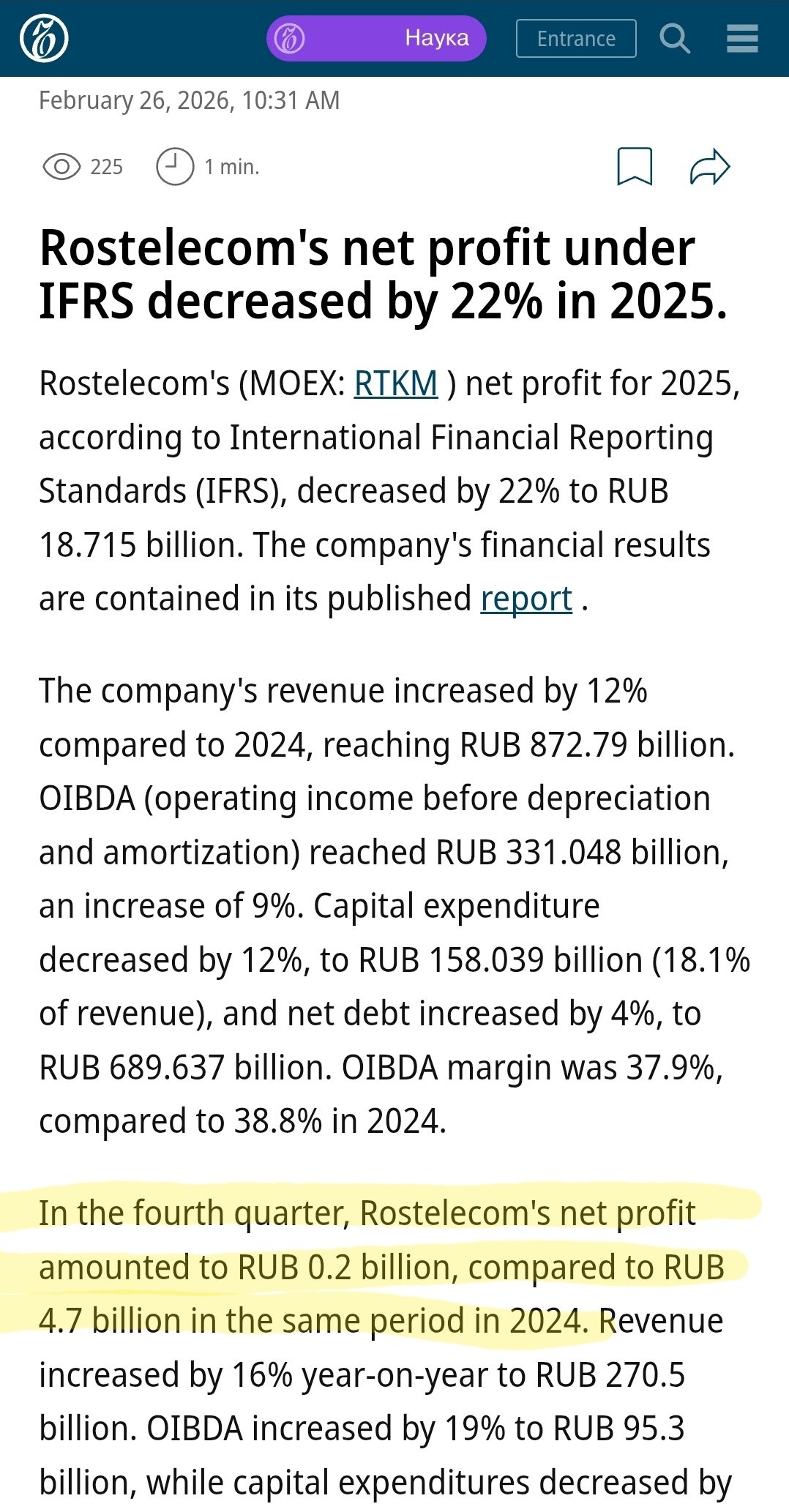 >Russia's largest telecom company comes in with horrific 4th quarter earnings that Russian media immediately tries to bury by headlining the full 2025 numbers that are somewhat less apocalyptic.>Rostelecom Earnings>Net profit Q4 –95.7% YoY>Net profit full year 2025 –22.4% YoYOOOOOOF LMAO