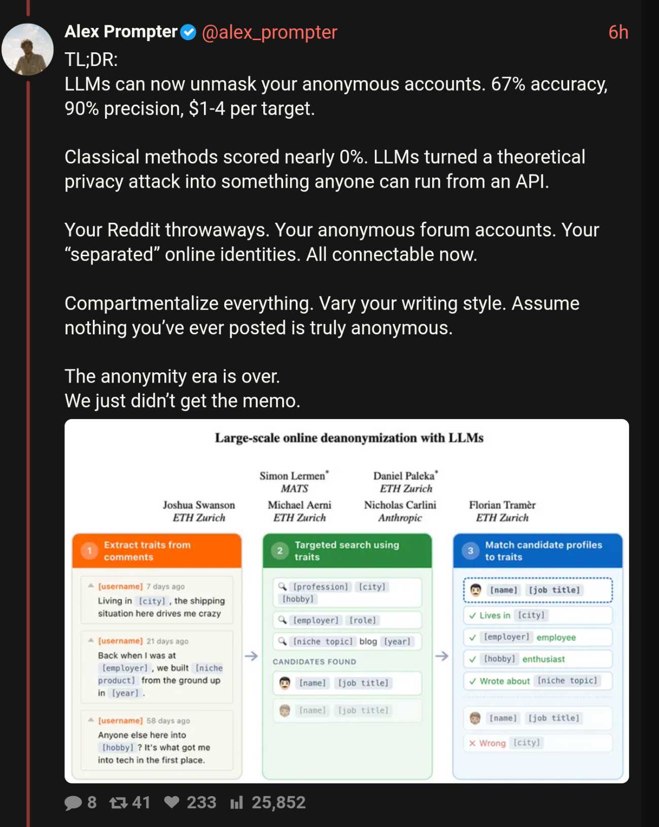 Your anonymous internet identity can now be unmasked for $1Not by the FBI. By anyone with access to Claude or ChatGPTWhat are the political implications?