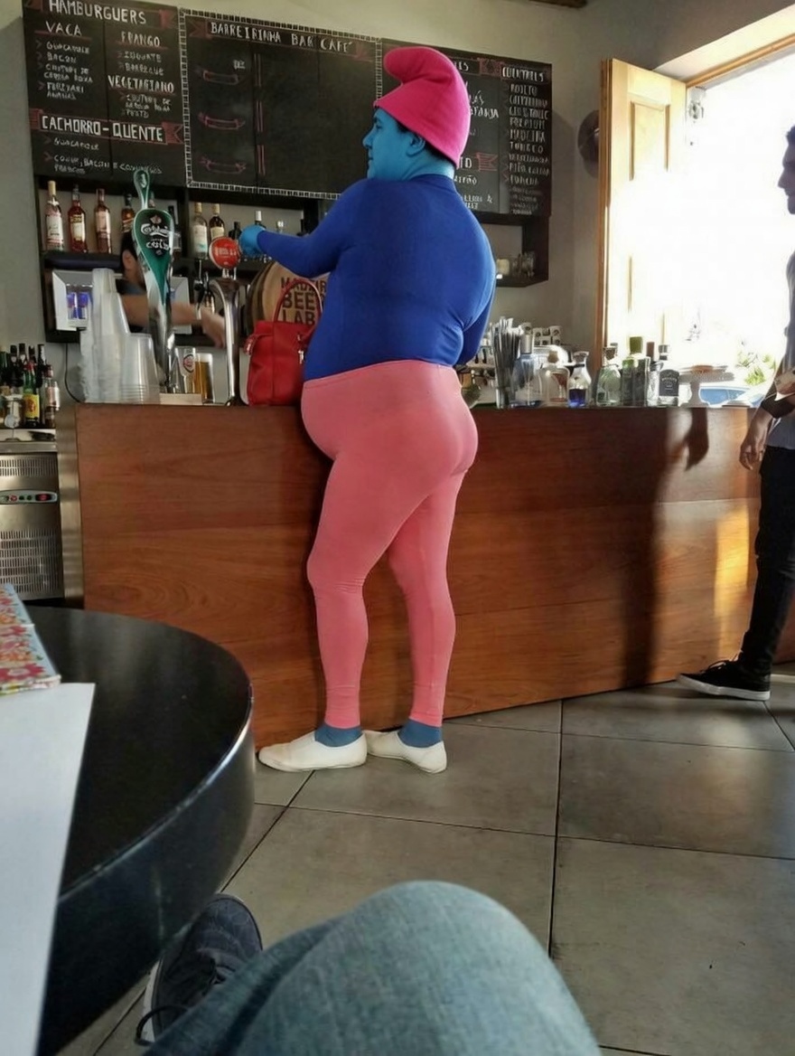 an overweight MtF cashier wearing a mask. It was dressed in girl clothes and had long pigtails with shitty pink dye in itI greeted it with "hey man" and it was visibly disappointed, when i left i said "thanks dude"my brain really fucked up there, i understood it was a tranny but my eyes see a man and the typical phrases are so ingrained