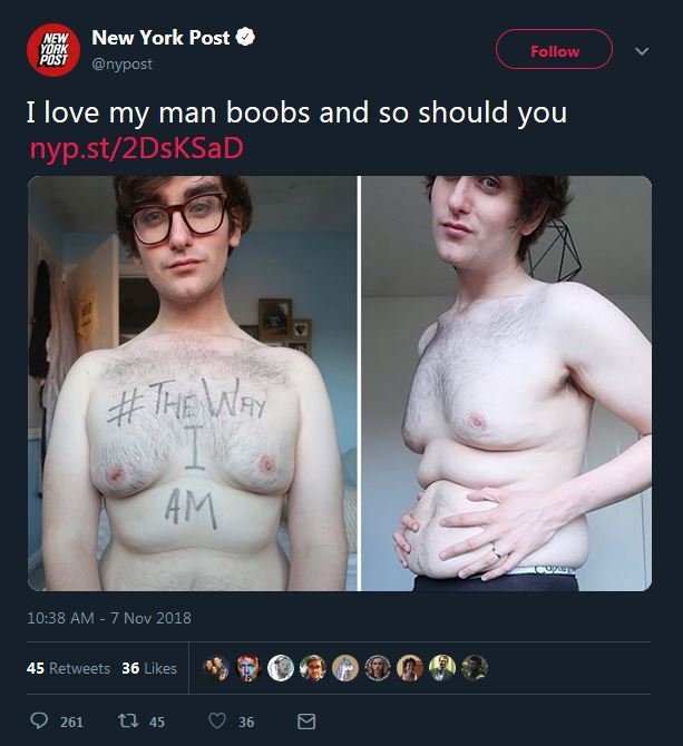 >>529285635ah yes the classic manly man ritual of getting your breasts out on social media with a hashtag written across them saying "the way I am", so rugged, so masculine