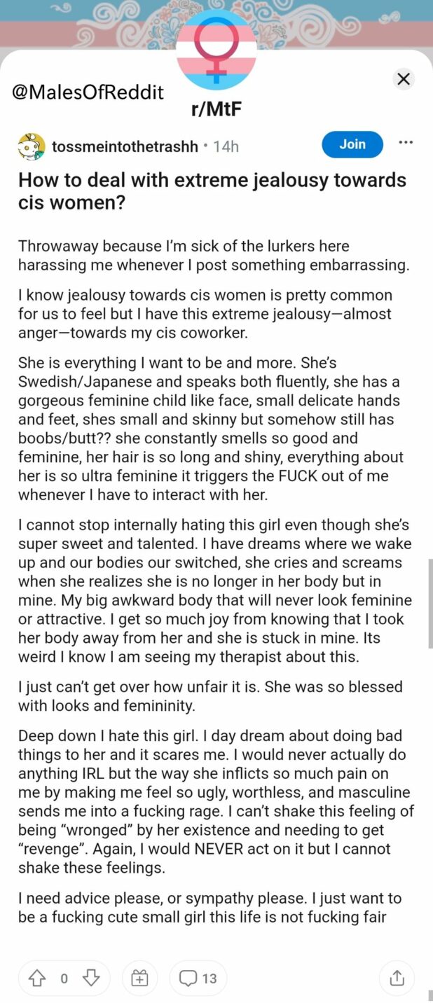 A troon-man used to work the drive thru of my local McD’s. She was rather pathetic, wore a leather jacket and cap, and a drawn on mustache. She constantly fished for affirmation, referring to me as “dude” and “sir”, desperate for reciprocation.