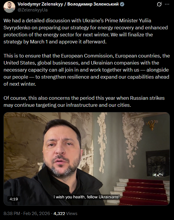 >We had a detailed discussion with the Ukraine’s Prime Minister Yuliia Svyrydenko on preparing our strategy for energy recovery and enhanced protection of the energy sector for next winter. We will finalize the strategy by March 1 and approve it afterward.>This is to ensure that the European Commission, European countries, the United States, global businesses, and the Ukraine's companies with the necessary capacity can all join in and work together with us — alongside our people — to strengthen resilience and expand our capabilities ahead of next winter.>Of course, this also concerns the period this year when Russian strikes may continue targeting our infrastructure and our cities.