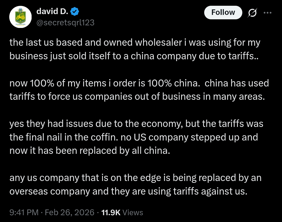>the last us based and owned wholesaler i was using for my business just sold itself to a china company due to tariffs.. >now 100% of my items i order is 100% china. china has used tariffs to force us companies out of business in many areas.>yes they had issues due to the economy, but the tariffs was the final nail in the coffin. no US company stepped up and now it has been replaced by all china. >any us company that is on the edge is being replaced by an overseas company and they are using tariffs against us.LOLOLOL