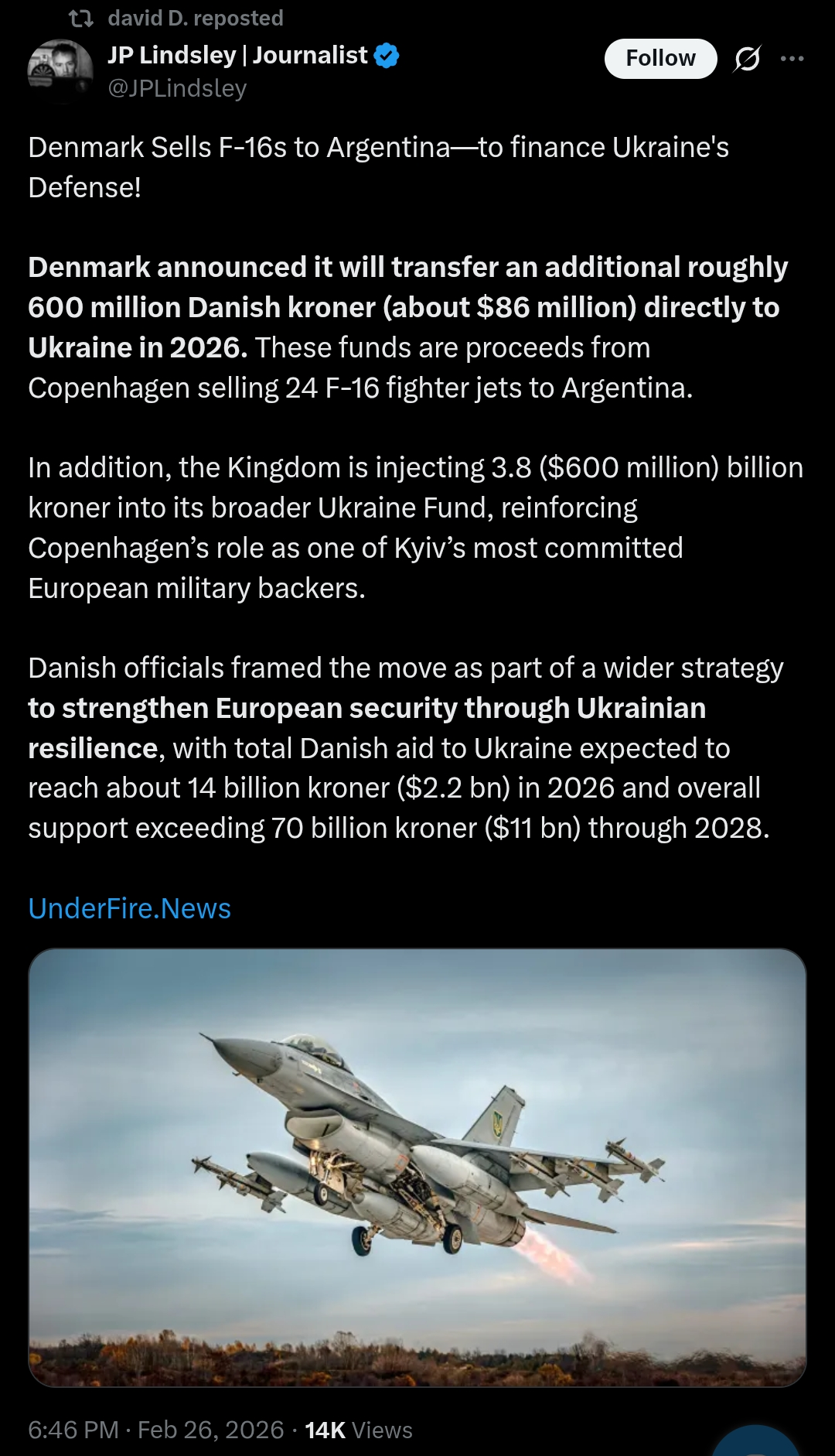 >Denmark Sells F-16s to Argentina—to finance Ukraine's Defense!>Denmark announced it will transfer an additional roughly 600 million Danish kroner (about $86 million) directly to Ukraine in 2026. These funds are proceeds from Copenhagen selling 24 F-16 fighter jets to Argentina.>In addition, the Kingdom is injecting 3.8 ($600 million) billion kroner into its broader Ukraine Fund, reinforcing Copenhagen’s role as one of Kyiv’s most committed European military backers. >Danish officials framed the move as part of a wider strategy to strengthen European security through Ukrainian resilience, with total Danish aid to Ukraine expected to reach about 14 billion kroner ($2.2 bn) in 2026 and overall support exceeding 70 billion kroner ($11 bn) through 2028.LÖL