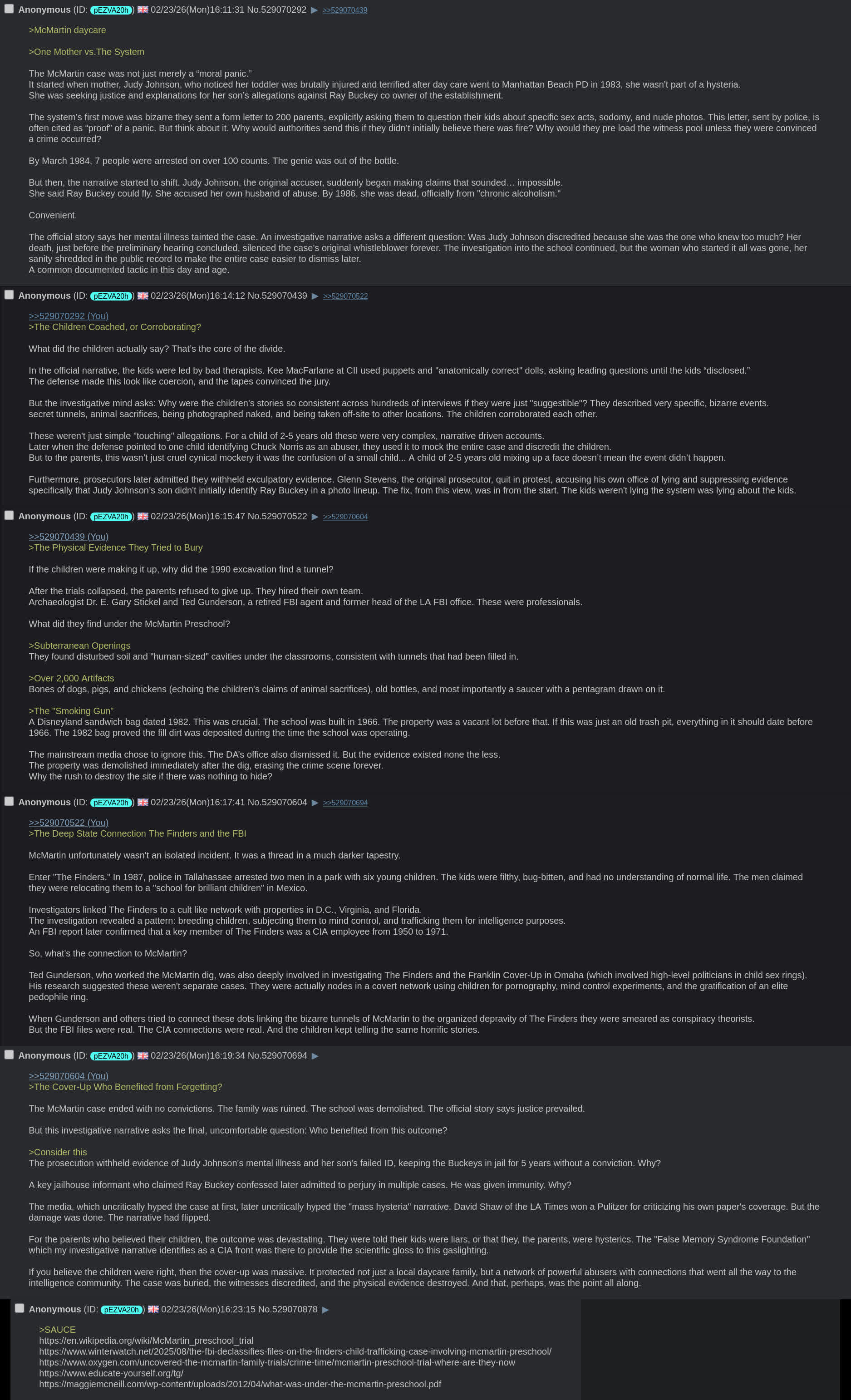 mc-martin-post-text7.9 KBhttps://files.catbox.moe/uxxnofepstien-time-line0.1 MBhttps://files.catbox.moe/u03yijDutroux-grab-text-4chan-thread28 KBhttps://files.catbox.moe/b44y57franklin-cover-up-post-text10.8 KBhttps://files.catbox.moe/nj2j2ujon-wayne-gacy-post-text27.8 KBhttps://files.catbox.moe/52u2qznatacha-gaitt-posts-text11.7 KBhttps://files.catbox.moe/p5qxqmspace-relations-bill-barr-synopis-post9.8 KBhttps://files.catbox.moe/a79xg1dunnard-affair-posts.19.7 KBhttps://files.catbox.moe/dfiou8finders-4chan-post3.8 KBhttps://files.catbox.moe/iadqxqoriginal plaint text from each investigation. Feel free to continue to work on any of them.