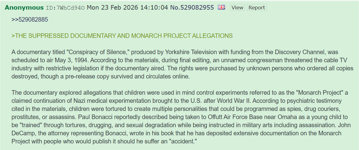 TPUSA > Paul Vallely > Michael AquinoIn his deposition Paul Bonacci says Aquino ran Project Monarch and the objective was to take over the US government. It starts off with his attorney using a code to unlock an alter personality. Begins at 23:54.https://youtu.be/W1qnZwgQCB0?t=1434
