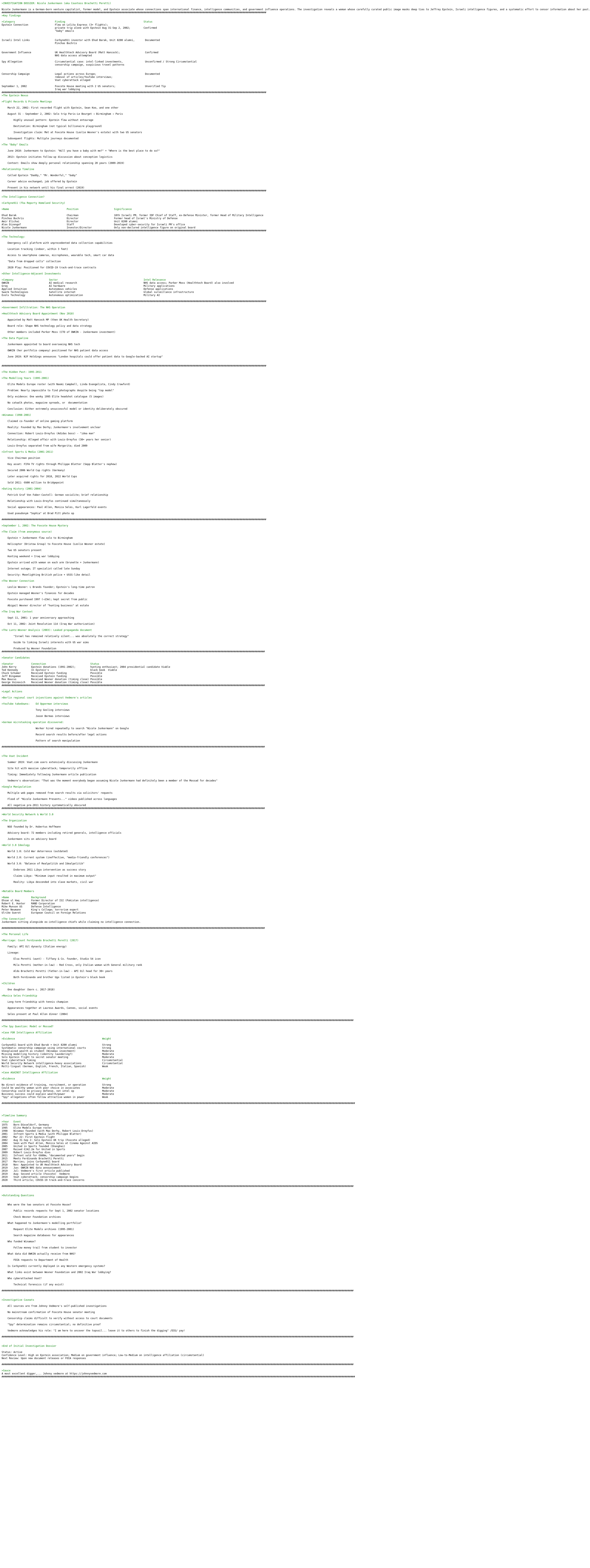 >INVESTIGATION DOSSIER: Nicole Junkermann (aka Countess Brachetti Peretti)Nicole Junkermann is a German-born venture capitalist, former model, and Epstein associate whose connections span international finance, intelligence communities, and government influence operations. The investigation reveals a woman whose carefully curated public image masks deep ties to Jeffrey Epstein, Israeli intelligence figures, and a systematic effort to censor information about her past.