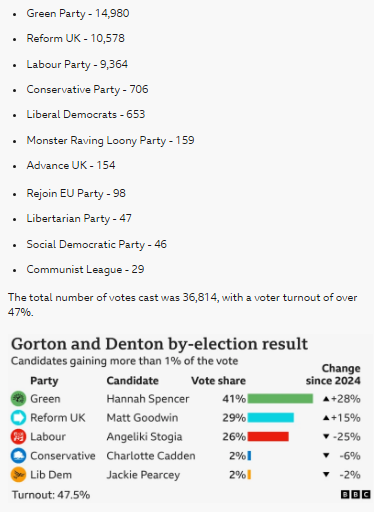 >the Greens officially won the by-election Boy, I REALLY can't wait for Restore Britain and Advance UK to fuck up the next general election and cause a Green-led government.